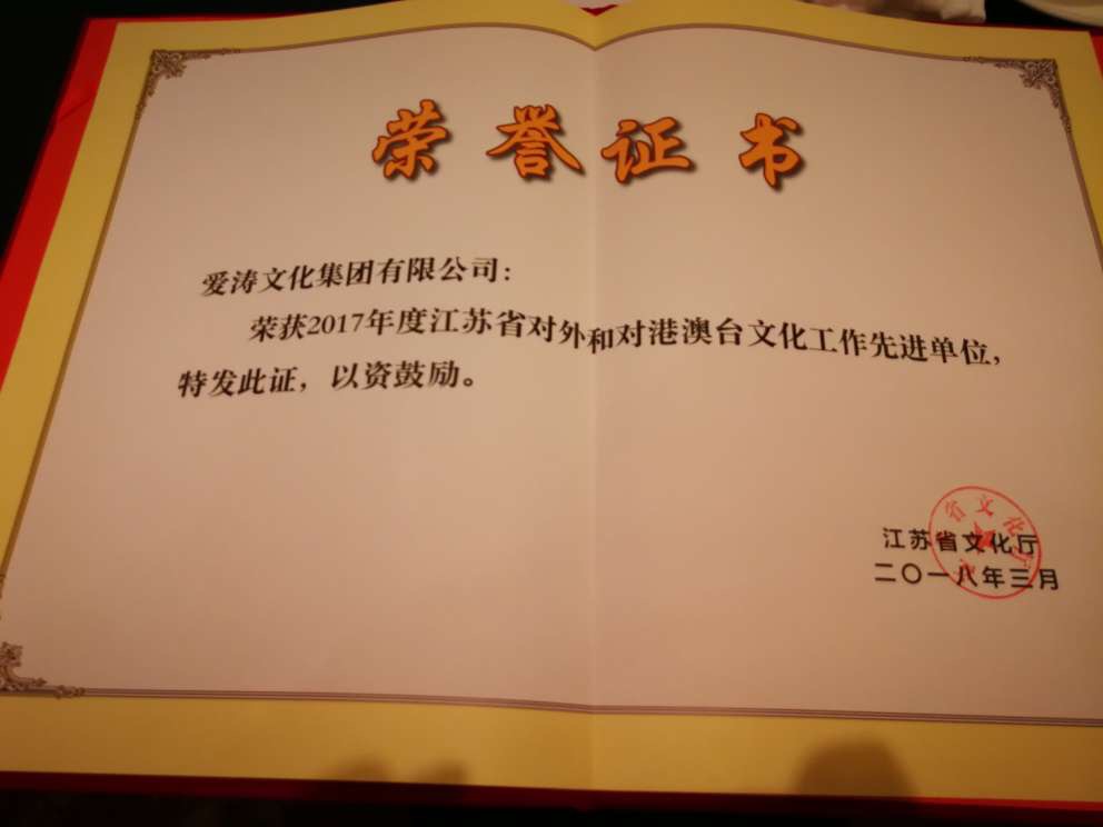 愛濤文化集團榮獲2017年度江蘇省對外和對港澳臺文化工作先進單位稱號